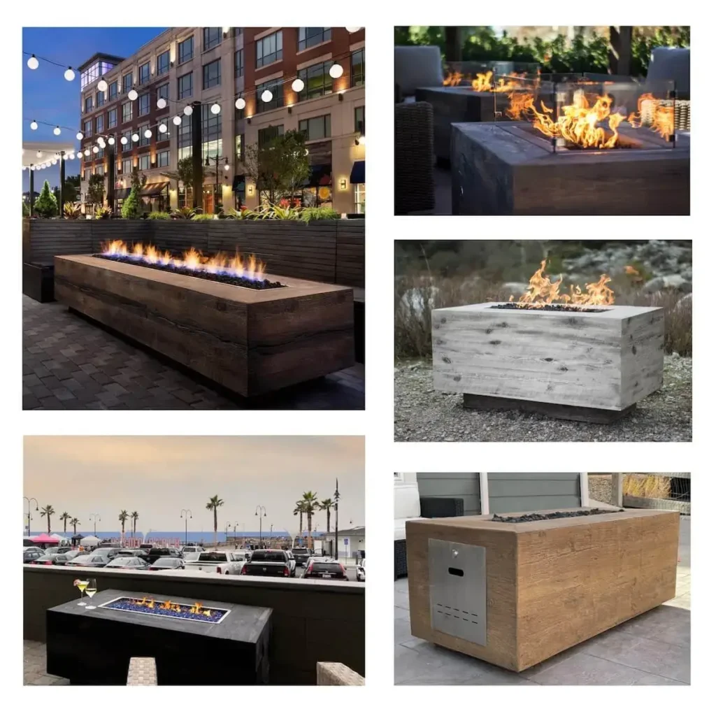 Introducing the enchanting Catalina Wood Grain Fire pit, crafted with GFRC (Glass Fiber Reinforced Concrete) and adorned with a mesmerizing woodgrain finish.