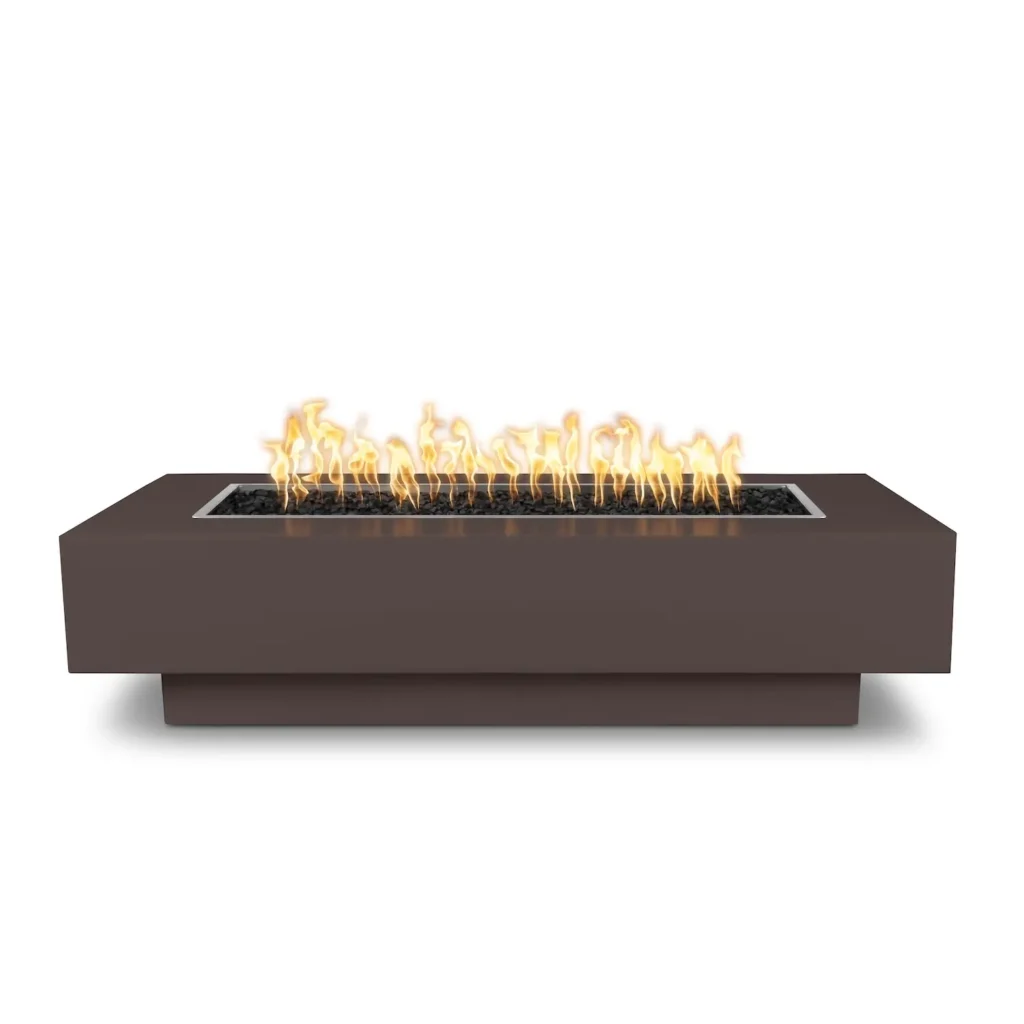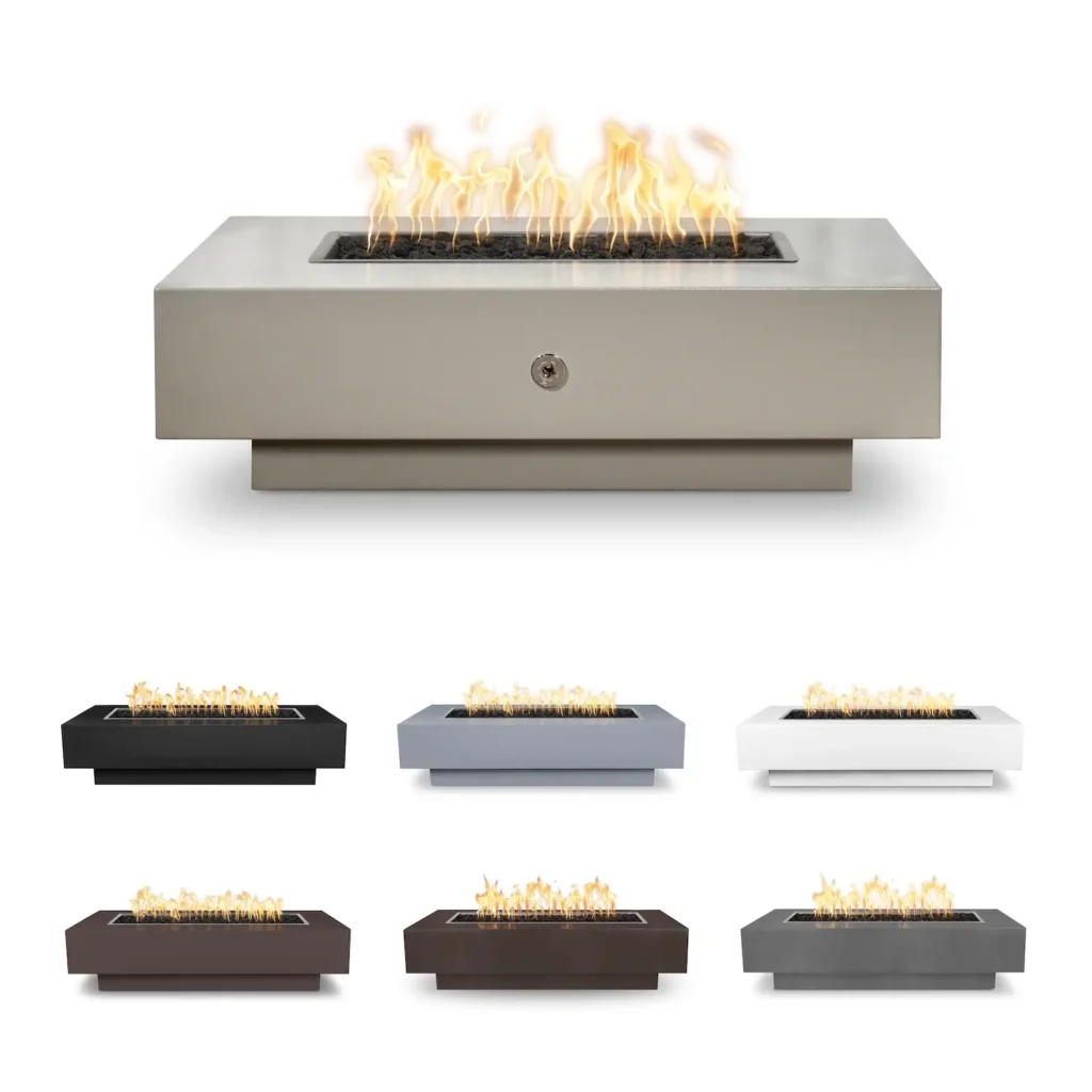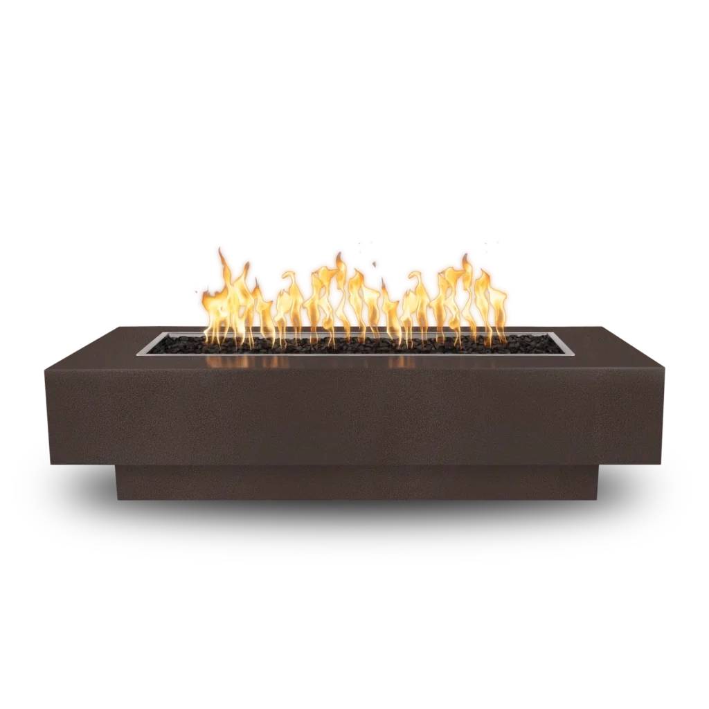 This powder-coated version of the Coronado Fire Pit comes in six length options, 48, 60, 72, 84, 96, and 108 inches long. All are 28 inches wide and stand 15 inches tall. There are seven color options and 5 ignition Options
