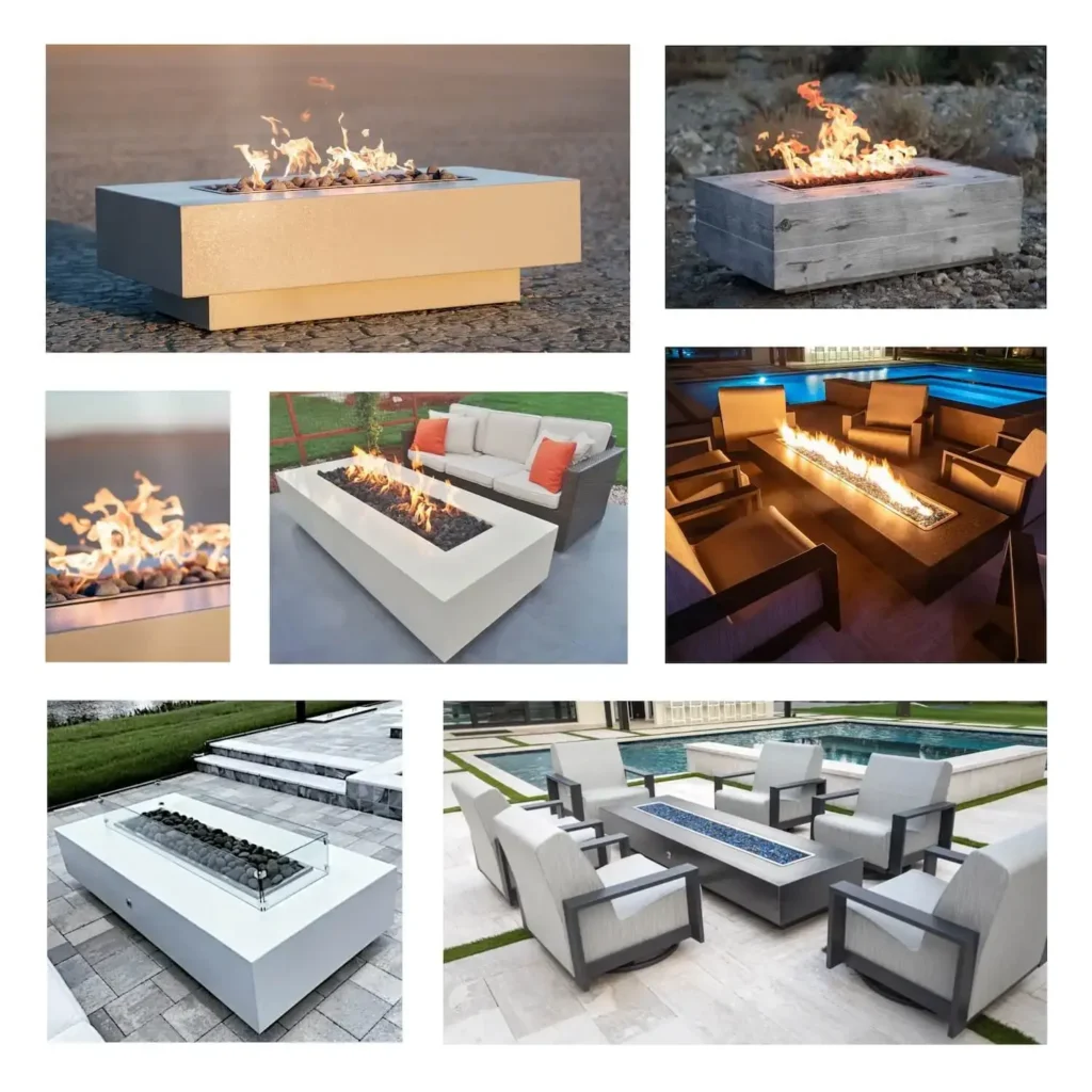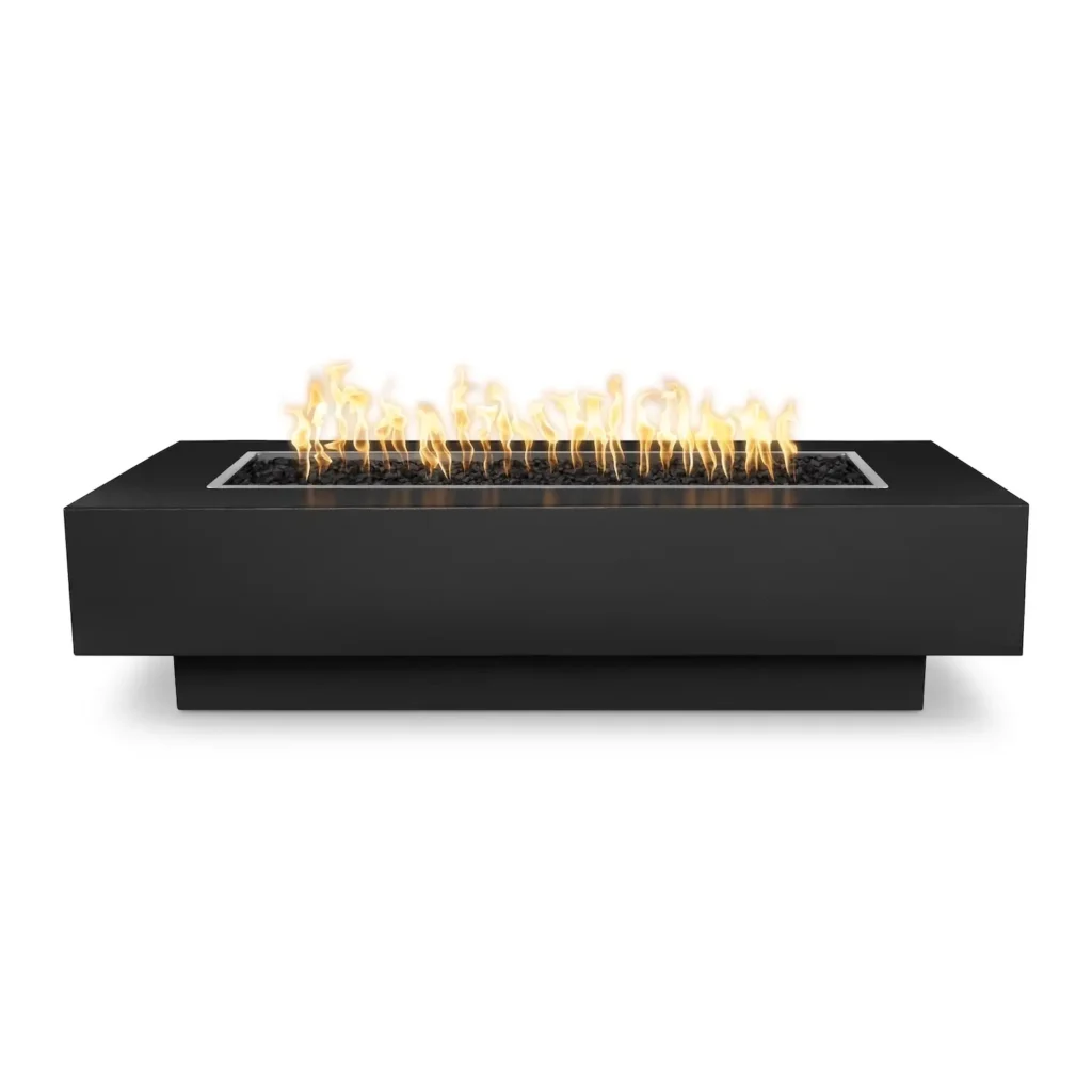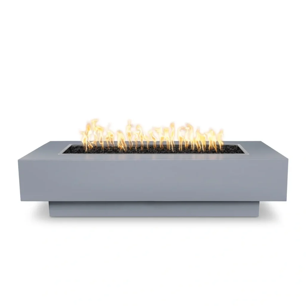 This powder-coated version of the Coronado Fire Pit comes in six length options, 48, 60, 72, 84, 96, and 108 inches long. All are 28 inches wide and stand 15 inches tall. There are seven color options and 5 ignition Options