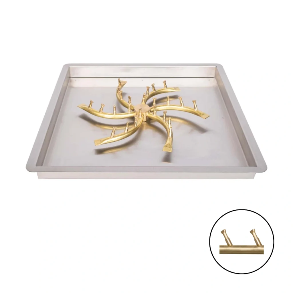 For a more budget-friendly option, a Stainless Steel Burner version has been introduced, while still retaining the signature Brass Bullet Tips for enhanced performance. See the Square Drop-In Fire Pit Pan with SS Triple S Bullet Burner for details.